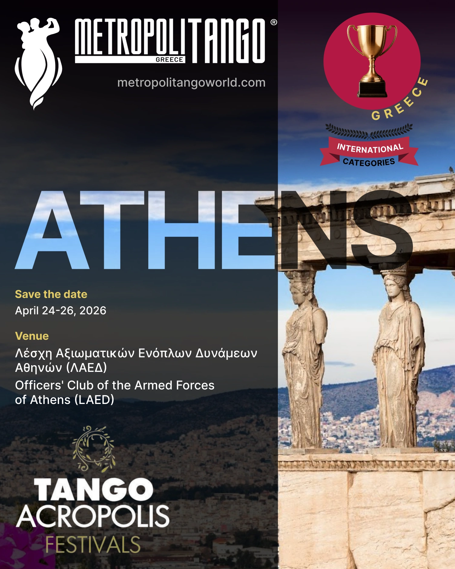 The Acropolis Tango Cup by Metropolitango World brings dancers together in the heart of Athens for a weekend of high-level competition, culture, and passion. Held at the historic Officers’ Club (LAED), this event features international tango categories, top-level judging, and the unique energy of Greece’s tango community.